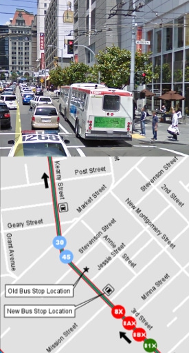Top: 3rd St. and Mission St., site of the new bus stop, courtesy of Google. Bottom: map courtesy of SFMTA, via SF Appeal.